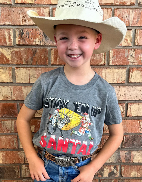 Saddle up for a wild Christmas with our Stick Em Up Santa Tee KIDS! This gray tee features a mischievous cowboy on a reindeer pointing a gun at Santa, whimsically telling him to "stick em up." Perfect for adding a playful twist to your holiday wardrobe.